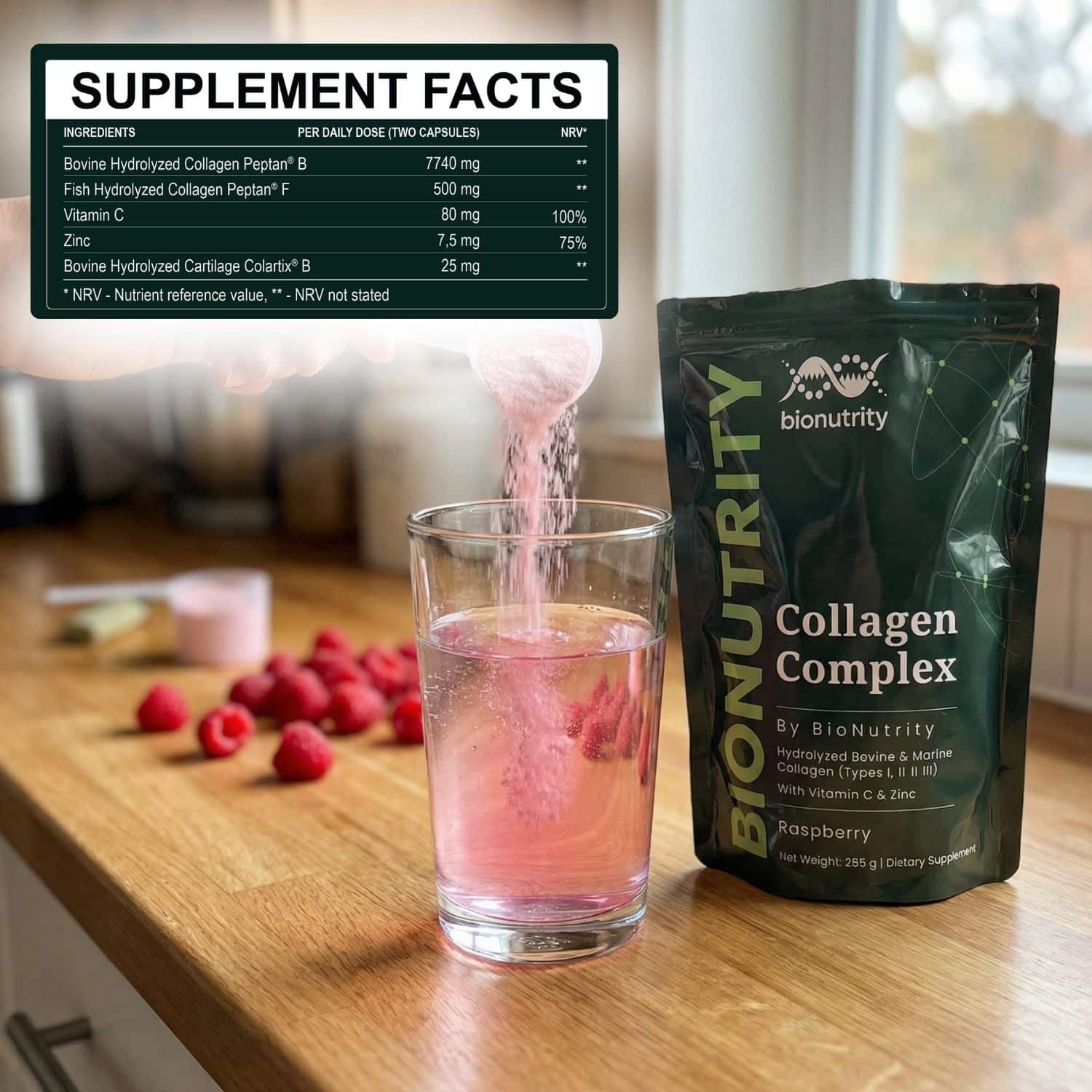 Collagen Complex van BioNutrity is een volledige, geavanceerde collageenformule, niet zomaar collageenpoeder. Het combineert gehydrolyseerde collageenpeptiden met zorgvuldig geselecteerde voedingsstoffen die de collageenvorming en -absorptie in het lichaam ondersteunen.