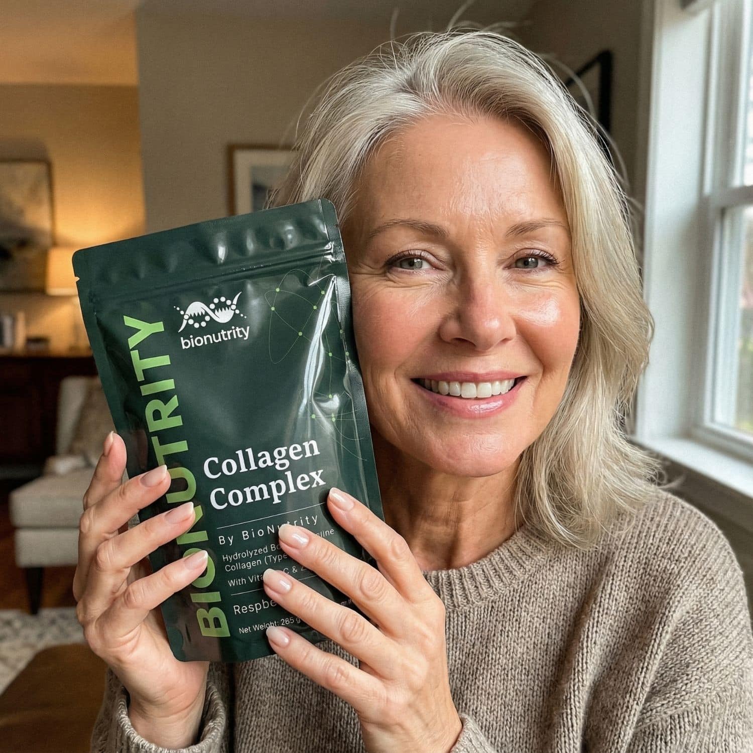 “Mijn huid begon er moe en dof uit te zien. Sinds ik Collagen Complex neem, voelt het steviger aan, vooral rond mijn wangen en kaaklijn. Vrienden blijven vragen of ik mijn crème heb veranderd. Dat heb ik niet — dit is het enige dat ik heb toegevoegd.”